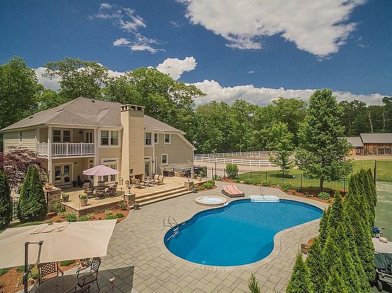 Very private beautiful patio with in ground pool, spa and tennis court. 14 plus acres with woods and trails. Mother In-law suite with full kitchen, bathroom & loft bedroom included in bedroom/bathroom count. Five stall barn with riding ring.