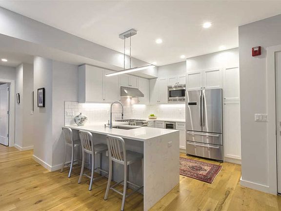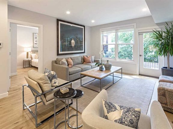 Located in ONE11 Monroe, a collection of 7 ultra-contemporary homes built in 2017, this stunning 3 Bed, 2 bath condo is garden facing, allowing for sense of privacy & serenity in the hustle & bustle of Hoboken. The feeling is distinctively boutique style with all of the conveniences of living in the city. Sunlight and garden views pour into every room through large east facing windows. Featuring 1,282 square feet of luxurious living space, the home is detailed throughout with 5â white oak flooring and contemporary LED lighting as well as a sleek, contemporary kitchen with luxury finishes such as quartz waterfall-edge countertops, Bosch appliances, breakfast bar and a built-in wine fridge. This aesthetic carries into the bathrooms with porcelain tile, quartz countertops, Toto Toilets, large soaker tub & walk-in shower. The master suite is massive and is complemented with a huge walk-in closet and ensuite bathroom. This home has been further outfitted with blackout shades & custom closet systems (a $15K value!) in every room. Other premium features include high-efficiency central heat and AC, tankless hot water heater, Nest thermostat & a large 600 sq ft. backyard with itâs own built-in outdoor grill, lawn, and patio. ONE11 Monroe is conveniently located near many shops, restaurants & just a few minutes walk to the Hoboken PATH for a quick commute into the city.