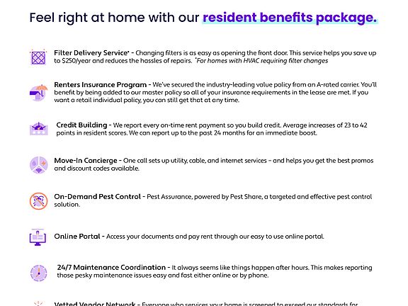 Resident will be provided with a Resident Benefit Package that includes furnace filter delivery, on-demand pest control, renter's insurance, and credit building!