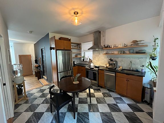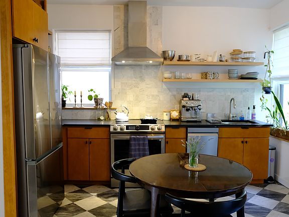 Main level 1 bedroom apartment features a high ceiling in the living room with hook-up for projector and a 120" electric screen. Hardwood throughout apartment with marble tiles in the kitchen and slate floor in the bathroom. The kitchen has stainless steel appliances and an induction stove, open shelving and granite countertops. The bathroom is tiled with a steam shower and a stackable washer/dryer. The spacious bedroom has built-in custom shelving in the closet. The backyard is fenced for privacy, has a sizable lawn area, a fire pit, plantings, a bluestone patio with a pergola. The unit has a ducted heat pump system for both air conditioning and heat. Apartments in recently renovated, historical brick building on Abeel Street. Located near the iconic Wurts Street bridge and within short walking distance to restaurants and shops. Street parking in front of building with municipal parking at the end of the block. Eighteen minutes to the Rhinecliff Amtrak station, and ten minutes to the Kingston Trailways station. Renter is responsible for own utilities. No smoking allowed. No subletting.