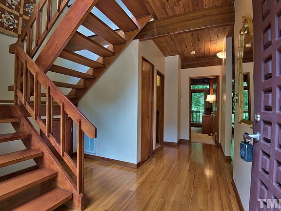 Sophisticated Treehouse style townhome overlooking acres of green space and creek. So private that 109 Arbutus just might be Chapel Hill's Best Kept Secret!! Stunning custom craftsmanship with updated kitchen and baths. Incredible windows and 2-STY Conservatory living area. Vaulted ceilings in LR. MBR has pastoral views and private deck in the woods. Two additional decks off of Living Rm &Dining Rm . Immaculate condition. Walk to Merritt's Pasture and mins to DT. One car garage, delightful garden space.