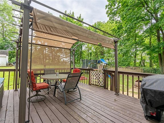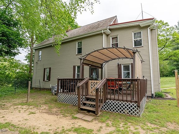Welcome to this distinctive century home, offering over 1,500 sq ft of living space and nestled on a private, wooded lot. Full of rustic farmhouse charm, this lovingly maintained home showcases years of thoughtful updates and character-rich additions. Natural light fills the home, accentuating the modern color palette and warm, inviting spaces throughout. A charming front porch greets you and opens into the foyer, where a convenient half bath is tucked away. Just off the foyer, the formal dining room features classic trim and updated flooring. The spacious great room offers tall windows with original trim detailing and provides the perfect space for relaxing or entertaining. Adjacent to the dining room, the kitchen features ample counter space, gray cabinetry with modern hardware, views of the surrounding yard, and direct access to the deck. Step outside to your own private backyard retreat, complete with a large deck, pergola, swing set, trampoline, and two generous storage sheds. Upstairs, you’ll find three bedrooms and a full bath featuring an updated tub/shower combo, a storage vanity, and a charming vintage medicine cabinet. Off the first bedroom, enjoy a beautiful second-floor sunroom with panoramic views of the front yard — a perfect spot for your morning coffee or a cozy reading nook. Additional features include a full basement with laundry, abundant storage, and a second half bath, plus hallway access to an unfinished attic offering even more potential. Conveniently located near shopping, restaurants, and highway access, this charming home is ready to welcome its next owner. Recent updates include new kitchen windows, new soffit gutters down spots, and gutter guards, remodeled upstairs bathroom, added a half bath on the main floor, updated AC, and new furnace. Schedule your private showing today!