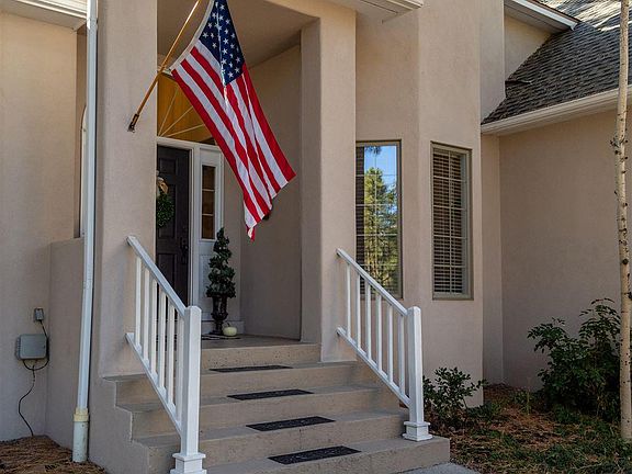 Modern farmhouse charm, this beautifully remodeled home is thoughtfully designed. If you are looking for a special home amongst the pines this house just may be what you are looking for. Outside details are brand new stucco and painted garage door surrounded by large ponderosa pines, hiking trials and outdoor activities abound. Walking into the entry way welcomes you with new floors, freshly painted staircase, New light fixtures, freshly painted cabinets in the kitchen with granite counter tops, chefs sink to work in and open to the family room with a new tiled fireplace and mantle adds a warming charm to the home, the fireplace does have a gas line. The main floor primary bedroom has double french doors that lead to the backyard patio and ponderosa pines. The bathroom is welcoming with beautiful tile accents, soaking tub, large walk in shower and double sink vanity. The closet has plenty of room for the clothes horse. The upstairs features three bedrooms and a renovated bathroom with double sink vanity great for kids, barn door for privacy and tub/shower with marble tile surround welcomes any guest. This house is immaculately maintained and is a turnkey property all you need is your suitcase!