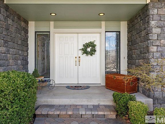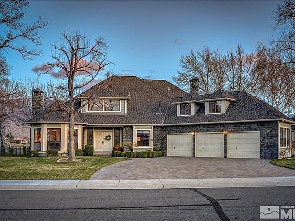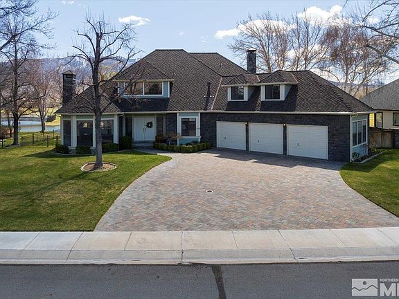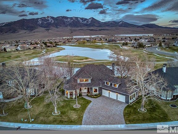 Welcome to charming 109 Augusta Ct, situated right on the water of Dayton Valley Golf Course with a view of the Pine Nut Mountain Range. As you come through the gated community, Augusta Ct is a quiet cut-da-sac with a very private feel as only one side of the st. has homes. The front yard is made of a beautiful lawn with a few mature trees and pavers leading to the 3 car garage and wide front door, decorated with stained glass on either side., Enjoy the 180 degree wide-expansive views right from your home and yard. Ever dreamt of bird watching right from your abode? Well you have found it. This home backs up directly to a body of water that brings the wildlife in. Sit on the back porch and enjoy the wildlife, golf culture, and the magnificent Nevada skies show off their colors and light up the mountains. Several of the rooms inside the house also have fantastic views including the kitchen, formal dining room, informal dining and living room, primary bedroom and bathroom, secondary bedroom and the bonus room off the garage. The kitchen has a view right from the sink, and opens up to the formal dining room on one side and the informal dining area and living room on the other. Great layout for the open concept feeling, to spend time with your loved ones and prepare/eat food and relax together. There are still plenty of rooms to not be completely immersed in each other's space. You can take care of business in the office, art and craft from the bonus room off the garage, or play ping pong and kung fu in the game room. The 3 bedroom count does not include the game room, bonus room, or office. Plenty of space for storage throughout the house and kitchen, including pantry, closets and lots of cabinets in the laundry room and kitchen. There is a big wrap around staircase at the entrance of the home including a chair lift. The primary bedroom is on the 2nd floor and the chair lift up the stairs is in working order. Presidential TL CertainTeed 50 year roof was installed September of 2012. Contact your preferred agent for helpful information including a Home Inspection report completed by the home owner and to schedule a showing.