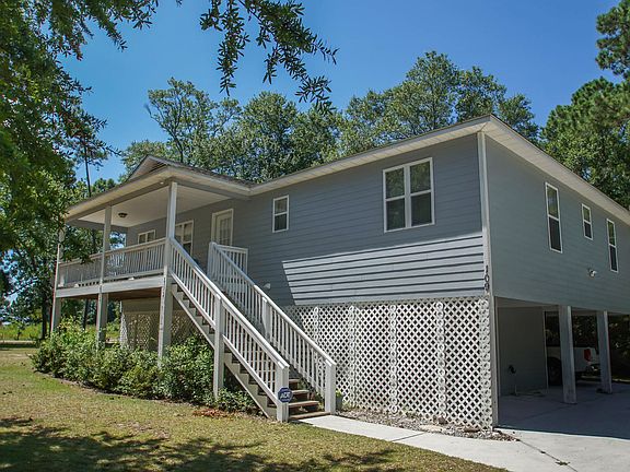 A must see beach style cottage nestled in the desired gated community of Chadwick Shores conveniently located to Topsail Beaches, Stone Bay and Camp Lejeune. Wrapped in concrete composite siding, this well-built 3 bed, 2 bath home was constructed on 8x8 pilings maximizing its views of Chadwick Bay and Topsail Island. Greeted by a rocking chair front porch and tucked away on a quiet cul-de-sac, this nearly 1,500 square foot home provides a much sought after serenity. Open living area, flooded with natural light from the abundance of 2 ½” trim windows, boasting smooth ceilings dressed with 2 ½” molding, and 3 ¼” baseboards carry through from the living room to dining and kitchen area. Kitchen hosts dual basin sink, 5 burner flattop Kenmore stove and eat-in bar. Sliding glass doors lead from dining area to 4 season sunroom suited for morning coffee or entertaining guest. Separated from the living area are two guest bedrooms and guest bath, washer and dryer room and master suite. Wet weather entry leads to enclosed storage area, covered carport and large screened in area with hot tub for relaxing by the water.