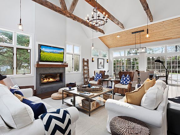 Recently renovated. Set on nearly a half-acre of private treed landscaping, this Post Modern offers the best of Westhampton Beach...close to Main Street's shops and restaurants and ocean beaches. The open layout includes a great room with wide plank oak floors and beautiful fireplace, cathedral ceiling, beams and skylights. There's also a dining room; gourmet kitchen with stainless appliances, granite counters, tumbled marble backsplash. With a master bedroom on the first floor and 3 more bedrooms and cozy sitting area on the second floor, this house offers ample space. Entire house will be designer decorated with brand new furniture. Outside is a inground heated pool and cabana with shower & bath.