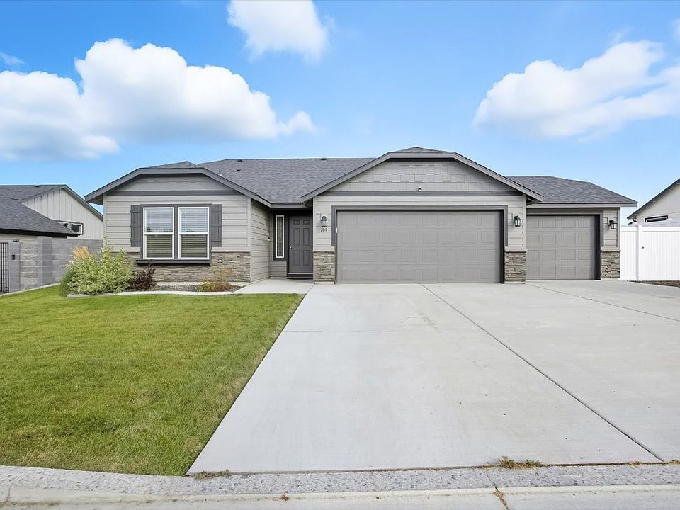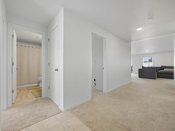 Newer 2025 home featuring a clean, modern layout with thoughtful upgrades throughout. The living room and primary bedroom offer high vaulted ceilings, creating an open and spacious feel, complemented by plush carpeting throughout the main living areas and bedrooms.
