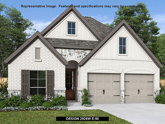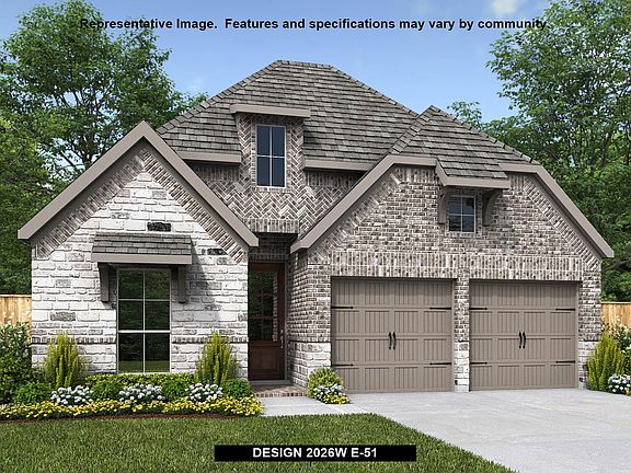 Entry leads to open family room with wall of windows. Kitchen features corner walk-in pantry and generous island with built-in seating space. Dining area set just across from kitchen. Primary suite includes bedroom with wall of windows. Double doors lead to primary bath with dual vanities, corner garden tub, separate glass-enclosed shower and walk-in closet. Home office with French doors set at back entrance. Secondary bedrooms feature walk-in closets. Two-car garage.