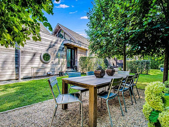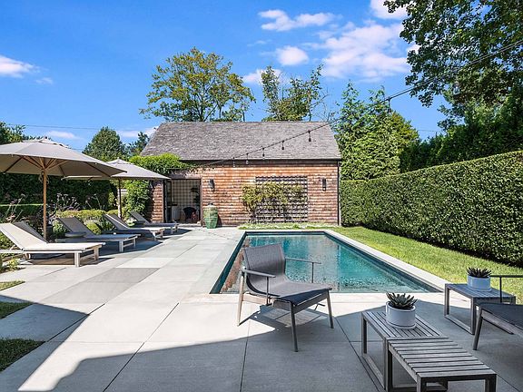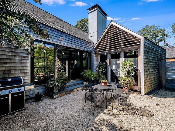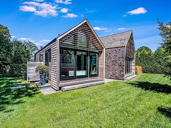 This ultra-chic new construction is pleasing from every angle. High end finishes, sleek, top of the line everything, in this now 5 bedroom, 4.5 bathroom beach house. The oversized central living space is stunning, with high cathedral ceilings and walls of glass on three sides. Sparkling Sub Zero/Wolf kitchen with wine fridge, natural stone counters, and custom glass backsplash. Added amenities include a screened-in sunroom and a fully equipped gym. All bathrooms feature walk in showers, Grohe fixtures and Toto toilets. Beautifully landscaped grounds host a large stone patio, a heated gunite pool, pool house, and two outdoor showers, one conveniently located next to the Primary Bedroom, the other closer to the pool. Nicely proportioned half-acre lot, with electronic gate and privacy hedges; convenient to all in the heart of East Hampton Village.