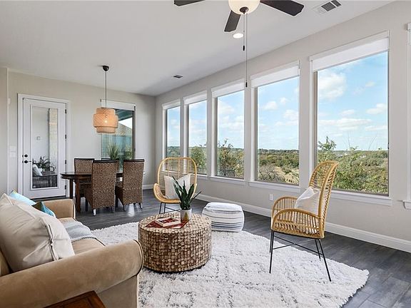 Wolf Ranch gem offers turnkey, single story living at it's finest. Situated on a greenbelt panoramic lot, this classic Drees home has been designed to perfection with a modern meets warm interior. Wood-Like Tile Floors, Water Softener System, Solar Panels and Custom Window Treatments are just a few upgrades to enjoy! Spacious plan includes a luxurious primary suite, a guest suite and a 5th flexible bedroom /private study or media room. Large Great room includes stunning fireplace while the chefs kitchen boasts a large Silestone island with enhanced cabinetry, open to family room. Relax in the Sun Room with large picture windows boasting views from all angles. Outdoor entertaining is effortless with outdoor fireplace & spacious covered patio overlooking canyon views. Just a few steps away from the state-of-the-art amenity center complete with zero edge pool overlooking the scenic San Gabriel River. . Enjoy attending the brand-new Wolf Ranch Elementary. Situated just one mile from Wolf Ranch Town Center and more retail coming soon!