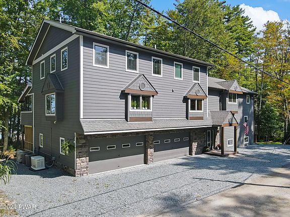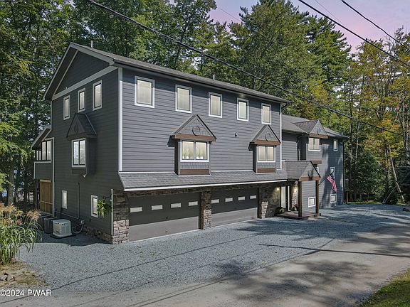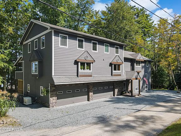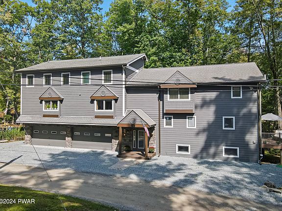 SIMONS POINT - LEVEL LAKEFRONT dream home with expansive Lake views on Lake Wallenpaupack! Walk into this spacious lakefront home and be prepared to be WOWED! With many new upgrades and improvements throughout the entire home, this turnkey house is MOVE IN READY! The open concept floor plan offers views of Lake Wallenpaupack from the living room, kitchen, dining area and 4 season room. The living Room offers natural sunlight, vaulted ceilings and a double sided wood burning fireplace. Enter the spacious kitchen and dining area which are sure to be the family gathering spot! Featuring a spacious island, granite countertops, stainless steel appliances, plenty of counter space plus a full pantry and an abundance of cabinetry. The dining area seats 10 comfortably and leads into the 4-season room perfect for relaxing anytime of the day with your favorite beverage and views of the lake. There are 5 bedrooms which include 3 suites including the primary suite with a luxurious bathroom, walk-in closets and an adjoining room perfect for an office, nursery, gym / yoga room or private sitting room, plus 2 additional bedrooms and a total of 5 1/2 baths. This home would not be complete without mentioning the large family room, Game room with ping pong table, Theatre room, dedicated office space and so much more including an abundance of garage space and an Electric Charging Station, storage areas and decking overlooking the lake, perfect for enjoying the July 4th Fireworks and watching the Eagles land on your private dock,  which can accommodate a boat and 2 jet ski slips! After a full day of boating and lake activities, relax in your hot tub or sit by your lakeside fire pit. Fully landscaped with dock and contents included! STR Friendly Community, perfect for INVESTORS! Close to town for Dining, Shopping and enjoying year-round activities at the lake!