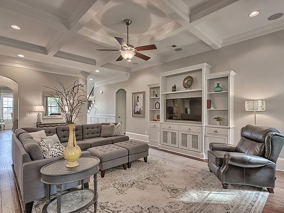 - Great Room: Molding, Bookcase, Floors-Hardwood, Ceilings-High (over 9 Ft), Ceiling Fan, Recessed Lights