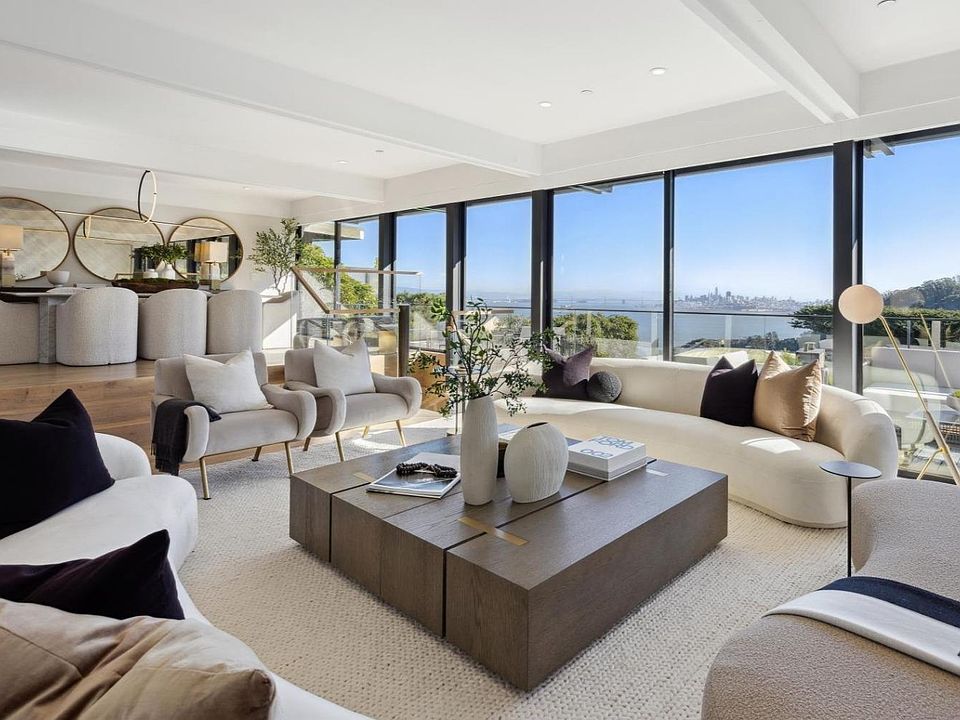 This reimagined architectural masterpiece blends modern luxury, functionality, and breathtaking views. Curated by renowned Bayon Design, the home showcases extraordinary finishes, custom lighting, and elegant, one-of-a-kind design elements. The double-height glass foyer opens to a living room with floor-to-ceiling sliders, terrace, and stunning views from Angel Island to the San Francisco skyline. The chef's kitchen boasts top-tier appliances and a custom coffee & wine bar. The adjoining family room opens to a private yard with heated seating area, fire pit, outdoor kitchen, and magnificent living wall. The lower level, accessed via a striking glass staircase, offers sophistication and relaxation with a lounge, 10-foot marble bar, glass-enclosed wine wall, a sleek media room, wraparound fireplace, and access to an outdoor retreat with a lap pool, outdoor shower, and heated stone pavers. A fourth bedroom or office/gym with a teak acoustic ceiling and waterfall steam shower complete this level. The upstairs bedroom level features a primary suite with panoramic views and spa-like bath. Additional highlights: 2 car garage, Tesla Powerwall, European oak floors, surround sound, A/C, and radiant heat. This home epitomizes luxury, comfort, and timeless style - minutes from San Francisco.