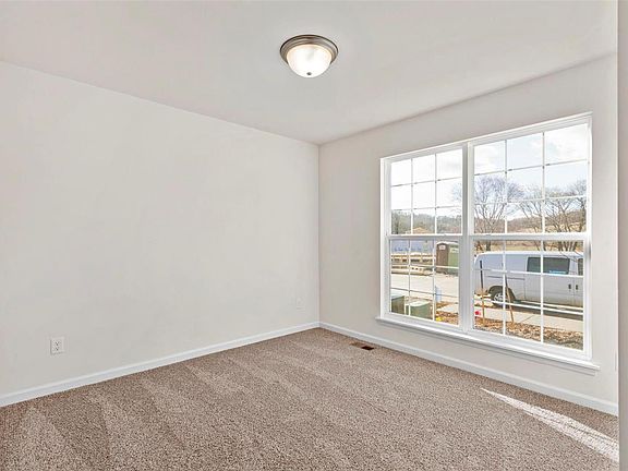 McBride Homes' new construction in Lake St. Louis' Creek Stone neighborhood. The Aspen II ranch model offers 3 beds, 2 baths, and will be move in ready this spring. Walkout homesite backing to common ground! Enjoy the bright, open living spaces with 6’ windows and wood laminate flooring. Kitchen features dark 42” kitchen cabinetry, island with breakfast bar, stainless steel GE appliances and walk-in pantry. Separate dining area with sliding glass doors leading to covered area for future deck. Various recessed can lighting in kitchen and great room, along with a great room ceiling fan and large window. Master suite features a walk-in closet, master bath double vanity and walk-in shower. Two add’l beds and hall bath. Main-level laundry. Brushed nickel lighting fixtures and plumbing fixtures. The exterior showcases dark gray siding and black shutters, creating a timeless aesthetic. McBride Homes' 10-year builders warranty and customer service ensures peace of mind. Similar photos shown.