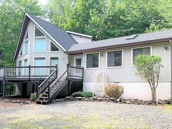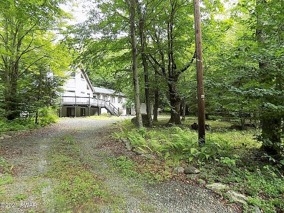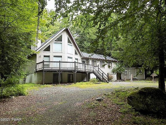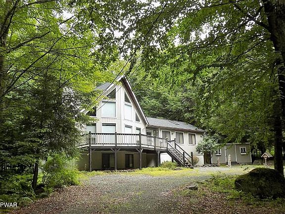 Minutes to Lake Wallenpaupack is this 2, 800 Sq Ft Prow Front Chalet set upon 4.86 Acres in Pine Hill Subdivision. Home features Huge Eat-In Kitchen Dining Room Combo w Prop Fireplace, Newer Appliances and Recessed Skylight and Center Island. Plenty of Cabs and Counters; L R w Cathedral 2 Skylights and Stone Faced Propane Fireplace and Custom Glass; 3 Bedrooms w one large Walk-In Closet and Window Seat + Outside Balcony; 2 Full Baths w one having Tiled Jetted Tub; Loft w Storage. Lower Level has Outside Entrance, On-Demand Propane Hot Water Htr. WoodStove and Washer Dryer, Rough-in Plumb for 3rd Bath, Radon Mitigation + Extra Basement Workshop! Outside has 14k Generac Generator; Composite Front and Rear Decks; 8' x 16' Utility Shed; 1 year old Roof and Circular Driveway! Call for your Personal Tour Today!
