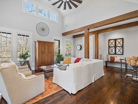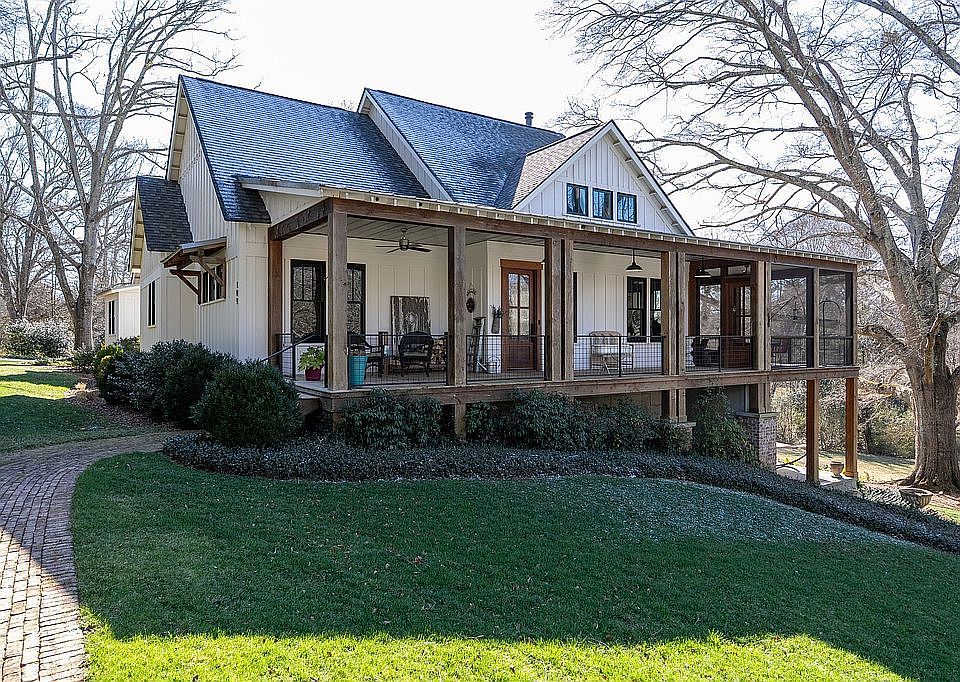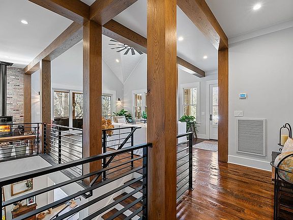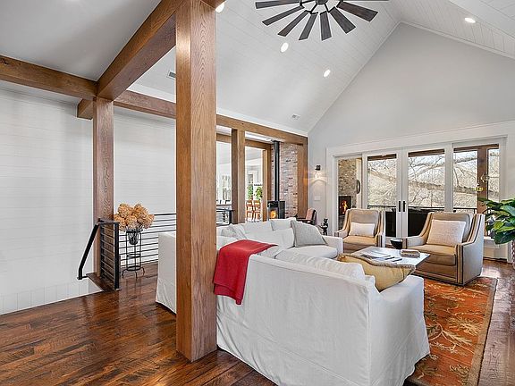 A truly unique custom Modern Farmhouse designed with the expertise of Tindall Architecture Workshop. A beautiful brick walkway welcomes you to the spacious front porch. You’ll enter into a bright open floor plan with post and beam living area with unique oak hardwood flooring. The kitchen has custom cabinets, a large walnut island, shiplap ceiling, quartz countertops, high end appliances and a large pantry with room for a second refrigerator. 10 ft ceilings and 8 ft doors throughout the house. From the kitchen you can access the covered breezeway to a grilling area, herb garden and 2+ car garage with plenty of bike storage. The master bedroom is on the main floor and conveniently connected to the laundry room. There are two large bedrooms on the lower level, both have walk in closets and their own bathroom. Also, on the lower level you’ll find space for second living room with a view, or workout room, there’s a kitchenette and a separate mechanical room with lots of storage space. Marvin double hung windows flood natural light into the home. Relax at the end of the day on your covered front porch or watch deer and wild turkeys from your spacious private screened in back porch with a beautiful bricked fireplace. 1500 sq ft of covered outdoor space provides a lot of options! This house sits on 3 acres with a 20 x 36ft barn large enough to turn into a tiny home or a workshop. On one side of the barn are a number of established raised beds to grow your own organic veggies, on the other side is plenty of space for your bonfire area right next to the babbling creek.