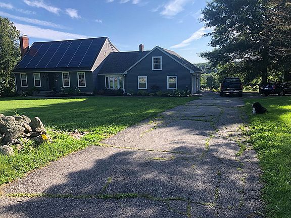 Classic cape with modern updates throughout including brand new hardwood floors, all new windows. Granite kitchen with large island and custom cabinets, subway tile backsplash and stainless steel appliances. A 12.6 kW solar system installed on roof for significant energy savings with locked in pricing through 2035. Beautiful 20’ x 40’ in ground pool with blue slate surround and patio to enjoy distant horizon views and sunrises from. Separate 500 sq ft pool shed with sun deck and electricity for entertaining and massive 900 sq. ft stone patio off main home. Wood stoves and Calacatta marble fireplace for additional heating in living areas, A/C split units for efficient cooling. Bone dry full size basement and two car garage with loft for additional storage. Mature trees and perennial gardens with lush, meadow style lawns and classic rock walls.