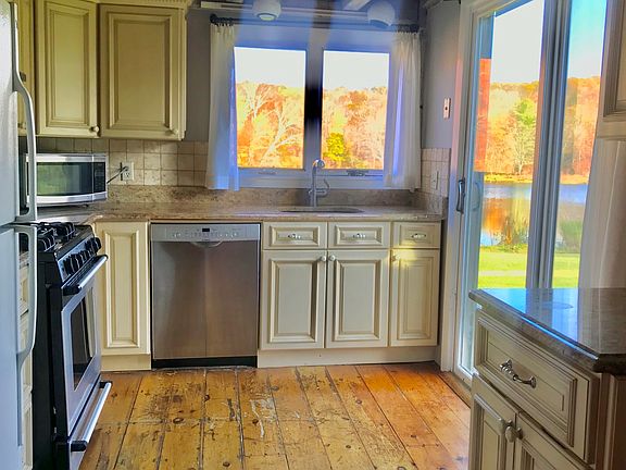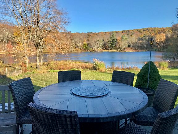 Antique Barn and Silo overlooking a 5 acre pond. Perfect for those who like unique living spaces. Main floor consists of kitchen with granite counters, stainless appliances, dining area with beamed ceiling and original stone walls and a full bath. Second floor has views of the pond and features a two story living room with beams, wide board floors, wood stove and a bedroom and full bath. Second floor also includes a master bedroom with hardwood floors and beams. Off the living room a staircase takes you to the original silo which has a small bedroom. A one car garage space and laundry room are included. Plenty of outdoor living space, including covered porch off living room, deck with awning off kitchen and large deck overlooking the pond. Ideal South Kent location close to Kent village shopping, restaurants, galleries, private schools, Metro North train station and Mohawk Ski Area. This furnished rental is a comfortable weekend getaway or full time retreat. Regarding summer rental months June, July, August, ask for rates.