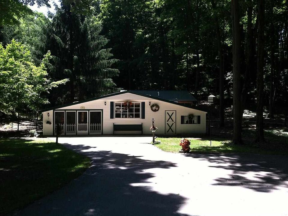 Stunning home, with a multitude of unique and thoughtful features make this 2 bedroom, 2 bathroom home a MUST SEE! With two large screened in porches, an attached 13X13 workshop, a well planned area for your four legged buddy, plenty of storage, beautiful interior, den, large bay and bow windows, large closets, walk in master closet, gas fireplace, paved drive, 2 car garage and well thought out floor plan on a gorgeous wooded lot, this home is fabulous! Home originally began as a singlewide, so you'd have to see this home to believe how amazing it is! Sound quality Structure, solid onsite built wood framed additions, quality workmanship all the way around! Aside from such luxuries as a newer Central Air unit, Steel Roof only one year old, quality appliances, newer water heater, and more, the association Ammenities include shared lake access, restrooms, showers, member's only area (park, pavilion), and trash removal on county maintained roads.