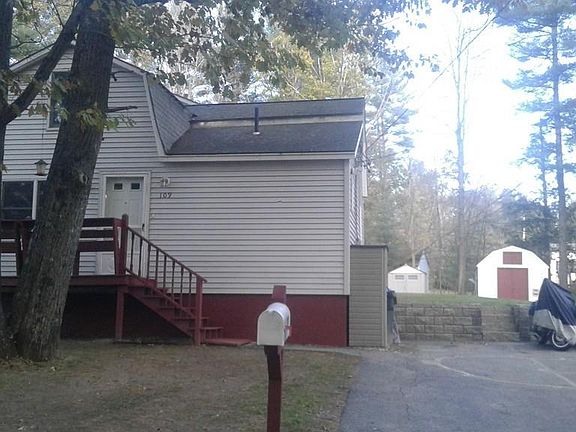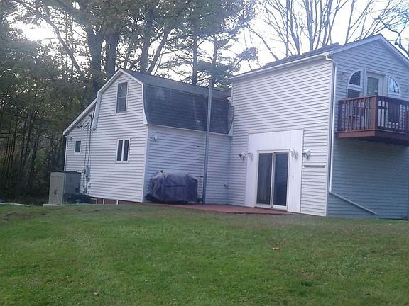 This home is Warm & Charming! Enter through front door to versatile, large foyer room with lovely staircase w/ hardwood treads to 2nd floor, centralized pellet stove facing open kitchen area, recently refinished parquet hardwood flooring and french doors. the kitchen is FILLED with custom built cabinets featuring decorative shelving and glass cabinetry, custom plate rack and recent stainless steel appliances! Living room with tile floor, beautiful wood ceiling, deep seated windows and slider to huge patio/deck. Master bedroom is FAB! Cathedral ceiling, 2 skylights, Atrium door & windows lead to a private balcony with spiral staircase to yard! Double closets, laminate flooring. Recently remodeled bath, double sinks, tile flooring, jetted tub & laundry closet.2nd & 3rd bedrooms with custom closets, window seat storage, nice level yard w. heated storage shed/workshop! Town Water & recently installed TOWN SEWER!!!