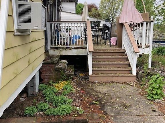 This two story home has much potential! first floor finished into three bR apt, with deck, second flood apt has been gutted and laid out but no finish walls, electric, insulation, attic is full walk up unfinished. parquet , laminated tiling flooring thruout. Vaulted ceiling in LR, full basement leads out to back. corner lot with flowering trees. House needs new roof and plywood., Owner selling "AS IS" Condition. No FHA loans will approve, cash or qualified rehab loan only.