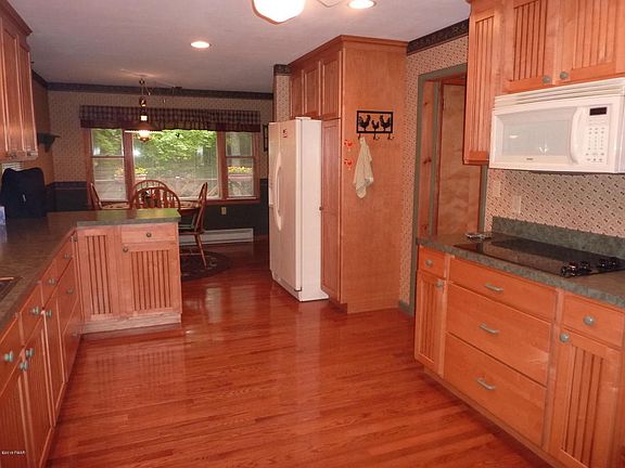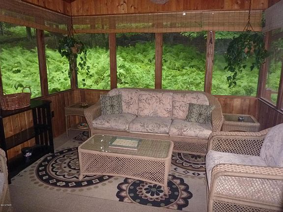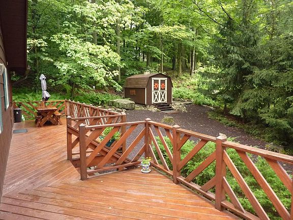 Dock slip on Lake Wallenpaupack available with this move-in condition 2 story contemporary home offering 3 bedrooms, 2 baths, open modern kitchen, dining area, private 12' x 12' screened porch, family room, freestanding lp gas stove, laundry closet w/washer/dryer & sink, attached 1 car garage w/electric door opener & 2nd floor bonus room, wraparound decking, landscaped, detached storage shed, large parking area. Amenities include beach & pavillion at the 'big lake', 24 hr security, paved roads, garbage pick-up, nature park w/walking trails, playground, and picnic area & boat racks on Lake Tanglwood. Pay to play 18 hole Defazio designed 18 hole golf course on site.