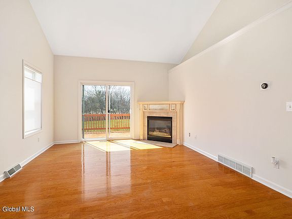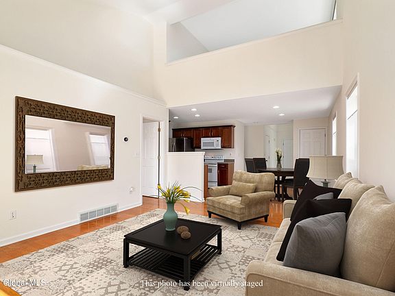 OPEN HOUSE CANCELED. Enjoy maintenance free living in the highly desirable Spring Meadows community serviced by the North Colonie School District. This end unit townhome sits on a quiet cul de sac, offers a wonderful floor plan, hardwoods and an abundance of natural light. The spacious family room with vaulted ceilings features a gas fireplace and is open to the dining area and kitchen, perfect for entertaining! Enjoy the first floor primary bedroom with en suite and walk-in closet! Convenient 1st floor half bath and laundry. Upstairs, you will find another spacious bedroom, a full bathroom and roomy loft area! Relax on the comfortable back deck. Plenty of storage in the full basement. New roof (2022) included with HOA fees. Fridge (2020), Washer/Dryer (2020).