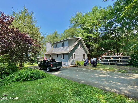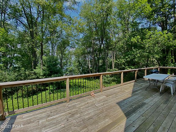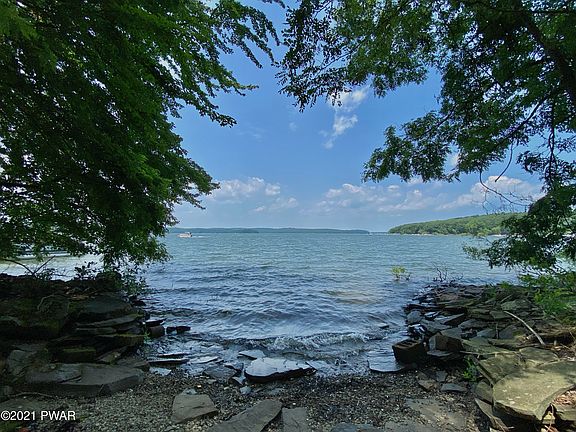 Lake Wallenpaupack lake front in Colony Cove! The property has 95 feet of level frontage. There is no shortage of parking here! There's room for the whole family. Enjoy the lake views from the expansive deck, overlooking a park-like setting. Home features a large master suite upstairs w/ a full bathroom. Newer kitchen with granite counter tops and newer appliances. The living room features a wood burning fireplace (and a 6 zone heating system) for the cold days in the Winter, or turn on the A/C split unit for those hot Summer days. T-Shaped dock is included, perfect for a boat and swimming! Home is set up for a back-up generator. Low community dues. Start your lake-front living!