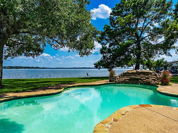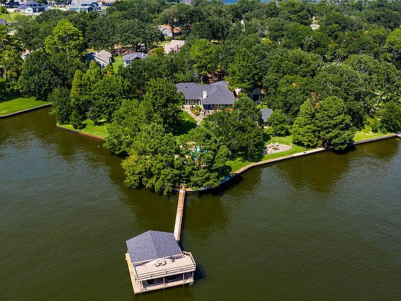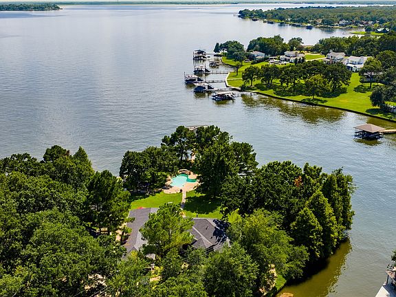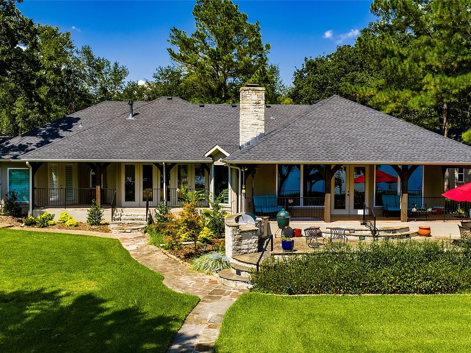 Sprawling one-story home on a stunning open-water peninsula with approx 500 feet of shoreline. Thoughtfully designed for lakefront living and entertaining, this home offers two fireplaces, and a cooks kitchen featuring quartz countertops, walk in-pantry, and a wet bar. Private primary suite with updated bath. Guest suites each have en suite baths. Additional office and flex room provide versatile space. Separate guest quarters offer privacy for visitors. Multiple covered porches overlook the pool with water features. Detached shop ideal for storage, hobbies and additional parking. A rare lakefront opportunity with space, privacy and incredible views.