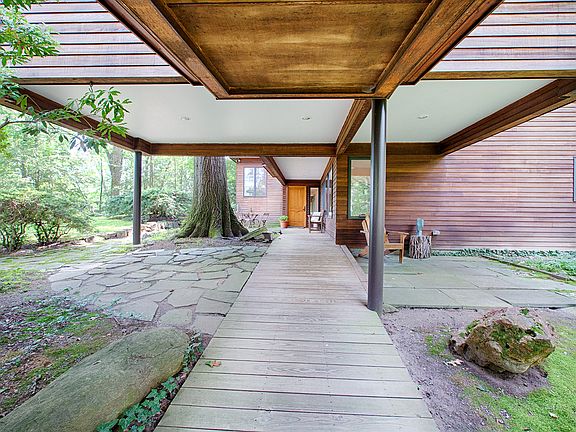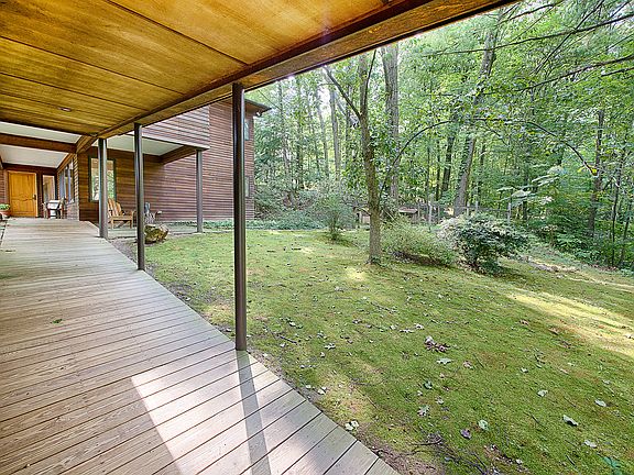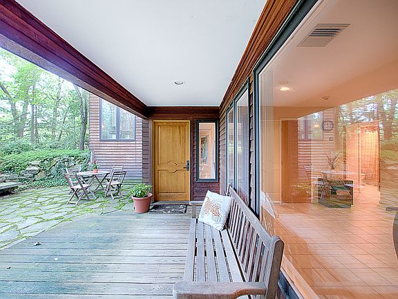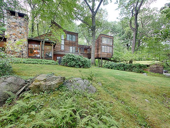 REDUCED! Serenity. Nestled in the Woods, this peaceful home on over 1.6 Acres of wooded property intertwines the outside and inside with walls of windows and sliding doors leading to the garden paths.Turn into the secluded driveway to enter this oasis. Stroll down the covered deck to arrive at the welcoming foyer. The great room immediately brings your attention outside through a wall of windows. The open flow combines the principal rooms with a custom built in cabinet separating the great room from the sunny kitchen with vaulted ceilings and skylights. 5 bright bedrooms include a lovely master suite with bistro balcony. A full in-law suite, greenhouse, home office, 2 car garage, patio and deck complete this custom home encircled by a canopy of trees. Seemingly remote, yet close to schools, lakes, and NYC.