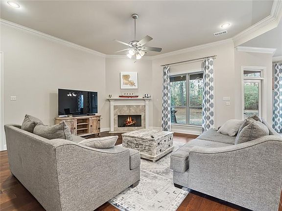 This 4-bedroom, 3-bathroom gem is packed with charm and style. Inside, you'll find an open floor plan with high ceilings, fresh paint, crown molding, granite countertops, and beautiful wood floors that give the home a cozy yet elegant feel. And on chilly nights, gather around the ventless gas fireplace for warmth and ambiance. Outside, the backyard is perfect for entertaining with friends and family around the beautiful majestic Oak trees. Located within minutes from historic downtown Madisonville, the Tchefuncte River & Blue Ribbon schools! you can relax knowing you're not in a flood zone. Don't miss out on this fantastic home in Madison Ridge Estates!