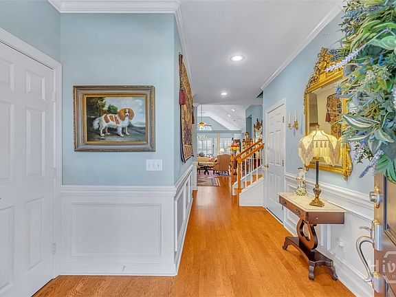 This 4BR/3BA townhome in Westbrook at Savannah Quarters offers 3,239 square feet of well-designed living space with two bedrooms on the main level and two upstairs. The kitchen features rich brown cabinetry, pantry storage, premium appliances, and a breakfast bar that opens to a gracious den. The generous living room boasts a high ceiling with a gas fireplace, mantle, and built-in bookshelves, complemented by a formal dining room. The main-level owner’s suite includes a spacious bath with double vanities and a custom walk-in closet. A second bedroom or office, full bath, and laundry are also conveniently located on the main floor. Upstairs, two large bedrooms share a Jack-and-Jill bath. A screened porch overlooks the fenced yard and wooded backdrop for added privacy. Upgrades include custom wood shutters, crown molding with bullnosed corners, chair rail, and a new roof.