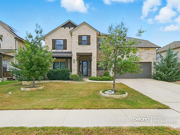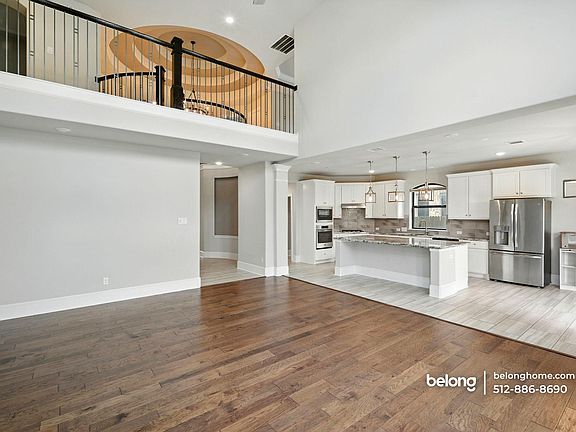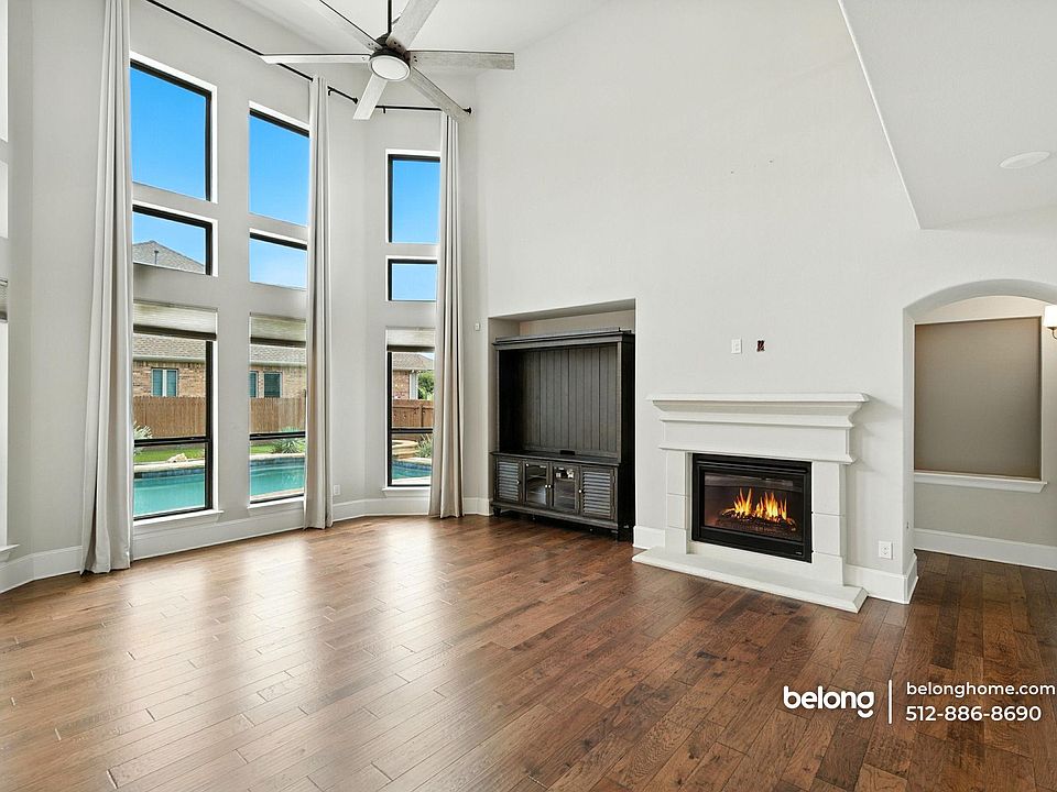 Soaring windows, a dramatic double-height living area, and a backyard with a pool, spa, and built-in grill set a bright, indoor-outdoor rhythm for daily life in this 3,406-square-foot gem. Step into the great room where rich wood-style flooring, an elegant fireplace surround, and open sightlines create a natural hub for gatherings. A dedicated office with handsome built-ins gives you a polished work-from-home space, while a generous upstairs loft offers a second living area for movies, gaming, or homework. Cooking comes easy in the expansive kitchen - long island for prep and serving, sleek counters, white shaker cabinetry, pendant lighting, stainless appliances, and a gas cooktop. Casual dining sits beside wide windows that keep everything sunny and connected to the yard. Retreat to a spacious main bedroom with a tray ceiling and an ensuite showcasing dual vanities, a separate shower, and a deep soaking tub. Three additional bedrooms and 3.5 total baths support comfortable routines and privacy for everyone. Outside, the swimming pool and attached spa pair with the grill station for weekend cookouts and lazy summer afternoons. Practical perks round it out - 2-car garage, plentiful storage, and room to live, work, and entertain. Loved for friendly streets and everyday convenience, this community puts you close to groceries like H-E-B, parks and trails along the San Gabriel River, and Georgetown's lively town square for dining and events. Two pet dogs are welcome! *Fireplace is for decorative use only and cannot be used without consent from Belong. *Our homes come as-is with all essentials in working order. Want upgrades? Request it through the Belong app, and our trusted pros will take care of the rest!
