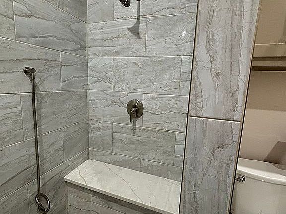 Large master shower with multiple heads, spray wand, bench and 2 niches