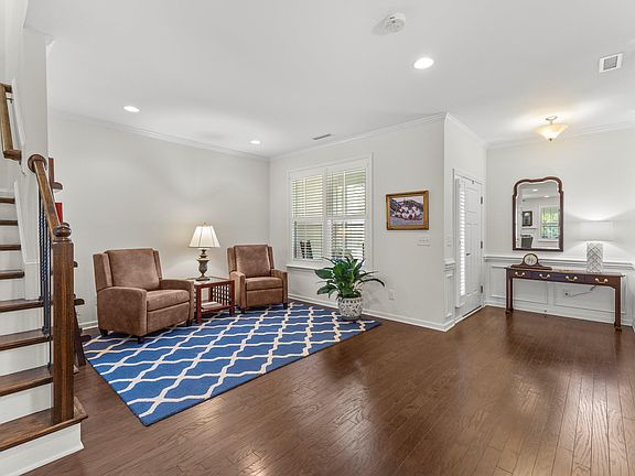 Location, space, no outside maintenance, check out this lovely townhome in Woodcreek. This innovative floor plan of 3 BR's, 2.5 Baths plus a bonus room up and an additional living room down has a ton of space. The interior of the home features 9' smooth ceilings on the first floor, 8' second floor, abundant closet space, hardwood flooring downstairs, carpet upstairs, ceiling fans, crown molding, shadow box and chair rails in the dining room and foyer. The kitchen has granite counter tops, an island with a stainless-steel sink and bar height countertop on one side overlooking the family room, lots of cabinet space (42'') with slide out drawers in all the lower cabinets and a nice size pantry and breakfast nook. Stainless steel dishwasher, range/oven, and microwave, and plantation shutters throughout the home. The owners' suite encompasses 2 spacious walk-in closet,s, dual vanities, tile floor and walk in shower and a garden tub. Bonus and the other 2 BRs are upstairs as well. Relax on the screen porch out back or have coffee on the front porch sitting area. Enjoy a beautifully landscaped yard and exterior of the home that is maintained by the HOA. The two-car garage is well equipped with lots of space and shelving. The community amenities offer resort style pool with a triple loop slide and lazy river, lighted tennis courts, a pickle ball court, basketball courts, playground, walking trails and clubhouse with Pavilion and fireplace. Both W/D do convey.