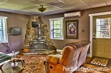 Extremely private 2.87 acres, views, AHS Home Warranty, tile & hardwood floors, 3 bedrooms, office, 2 baths, vinyl siding, family room, 2 heat pumps, new architectural shingled roof, outbuilding w/electricity, long private blacktop driveway, winter views, large deck-partially covered.