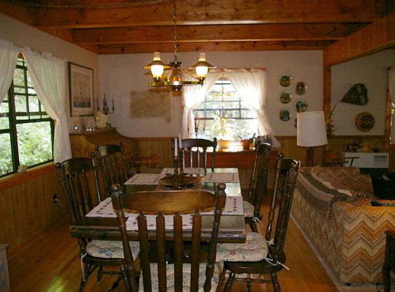 Wonderful summer home in the Cattail Creek community is on 1.78 mostly wooded acres with Ogles Gap Creek along the lower line. Long distance mountain views through the trees. Fully furnished, 3BR/2BA with master on main and very spacious rooms. Hardwood and carpet floors, great room design with large dining room, beamed ceiling, monitor heater. Two bedrooms, a bath and a small office upstairs. Long covered porch across the front of the home with a lower deck on the far side with a hot tub. Has a detached 1 car garage. Nice, private setting!
