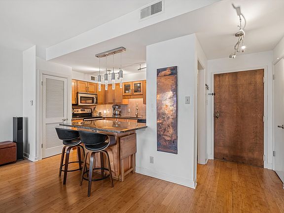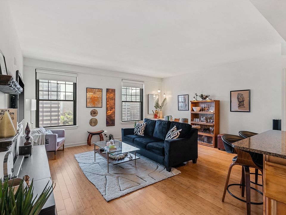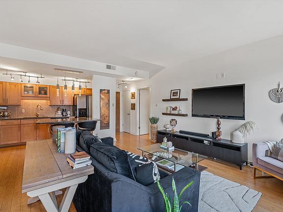 Gorgeous open floor plan in a cherished historic building. River views from living room, screened windows, & tons of natural light make hardwood floors sparkle. Unique floor plan in this already spacious unit, third largest on the floor. Storage and parking available per unit, on site management and luxury amenities. Gym, rooftop and pool! SS appliances and window treatments stay. W/D hook ups in primary closet, complimentary shared laundry on the floor. Walk everywhere from this stunning condo.