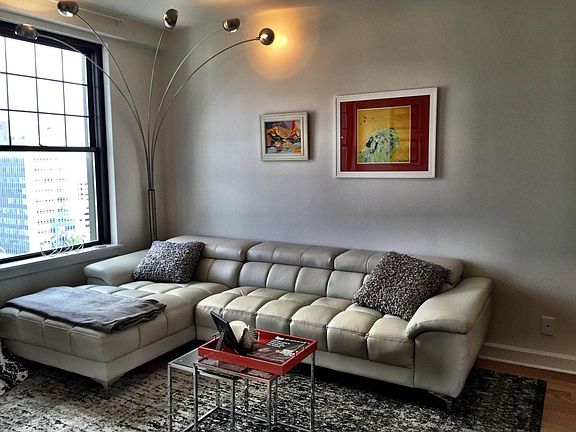 Fully furnished, modern flat conversion in one of Memphis' grand old hotels. Built in 1924, the Claridge Hotel housed the Balinese Room, where the likes of Elvis, Tommy Dorsey and more spent weekends creating what is now Memphis' magical music scene. A historic landmark, much of the original marble and woodwork has been preserved in the common areas; while the flat itself is contemporary luxury. Plenty of storage with four huge closets (additional storage rooms for rent in basement), the flat is spacious and flooded with natural light. Custom blackout curtains ensure a good night sleep, while providing beautiful texture to the space during the day. Owners are decor/art specialists and the flat reflects this in every corner. Furnishings are top of the line, sleek glass, leather, restored wood and luxury linens. Kitchen appliances are stainless and new! Two washers and dryers are located on each floor as well as a trash chute. So no hauling your laundry or trash up and down like a typical building. Indoor heated pool and jacuzzi are opened year-round as well as a well-equipped gym. The 17th-floor rooftop deck has sweeping views of the river, downtown, pyramid, and is one of the highest in Memphis. Plenty of tables, seating and gas grills are provided complimentary as is a fresh rooftop herb garden in season. Fantastic for hosting or simply taking in sunsets. Ground floor coffee shop with room service! Completely turn-key! Just show up and move in. Owners are a family living in Memphis, so just a phone call away should you need anything. Fully furnished with luxury linens and professionally curated decor. All utilities included (high speed internet) except electric and cable. Includes, pool, hot tub, gym, rooftop deck with grills, downtown skyline views.