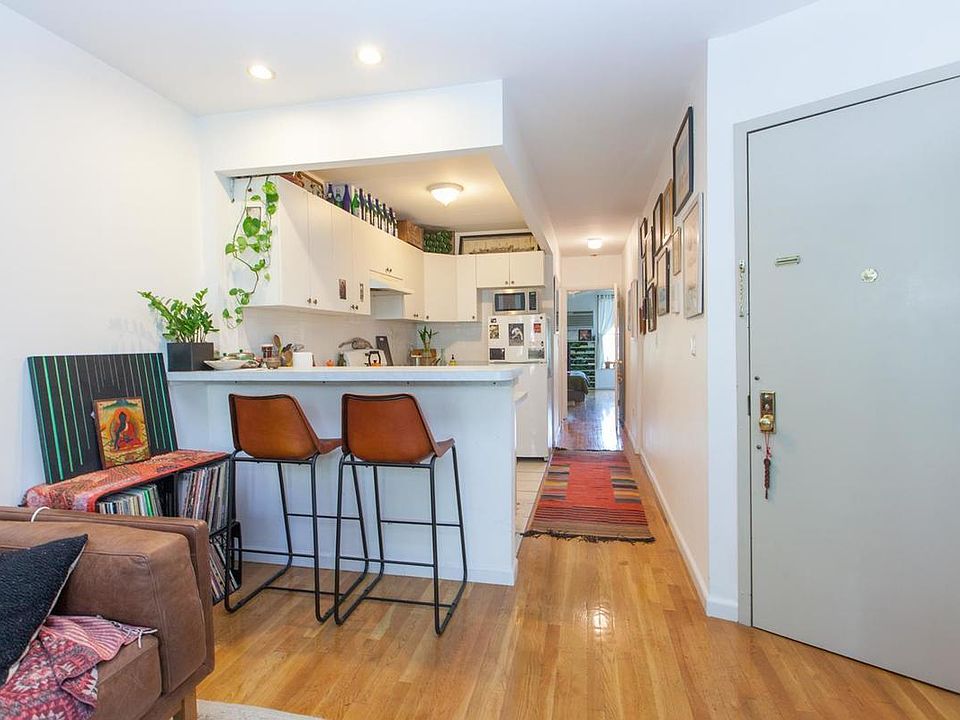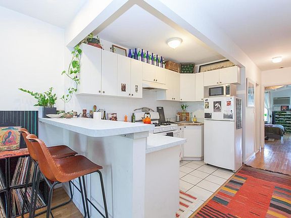 Great Greenpoint 1BR between the parks and flooded with natural light. The open kitchen is well-equipped with a gas range, new refrigerator, lots of food prepping space, and a long counter for barstools. Hardwood floors and attractive wood countertops compliment each other, and there is plenty of cabinet space above and at floor level. The bathroom features a shower bath with sliding glass doors and mirror cabinet. The bedroom has lots of closet space with built in lighting in the double closets and a convenient shelf space above. All in all, this is classic Greenpoint living, perfect for a couple or singles looking for a place of their own in a fantastic, quiet neighborhood. Nearby amenities include McGolrick and McCarren parks within easy walking distance, shopping and dining along Manhattan Avenue, and the subway only five minutes away at Nassau Avenue.