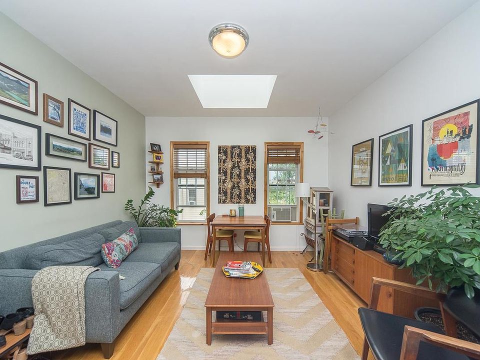 Classic Greenpoint prewar 1BR with great updates. This is a top floor unit with big skylights in every room bringing light in throughout the day, and shades installed so you can control the sunlight in the mornings. The tile-floored kitchen has plenty of cabinet space, with hardwood floors throughout the rest of the apartment. The bedroom is large enough to fit a king-sized bed, and has plenty of closet space and shelving built in. The bathroom is brightly lit from a skylight above, and also features shelving for towels and toiletries. This unit is in a great location, near the parks and only 6 minutes to the G train at Nassau Avenue. Plenty of shopping and dining are available along Manhattan Avenue, and the neighborhood is quiet and pleasant. To schedule an appointment, please call or text the number provided.