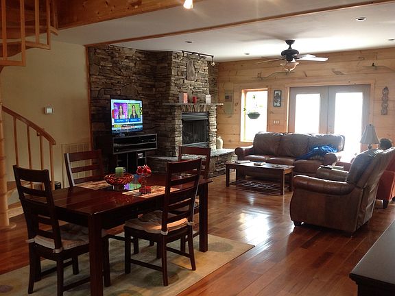 Custom built beautiful open floor plan home with 3 BR, (plus a den) & 2.5 bathrooms. The living room has a gorgeous stone fireplace. French doors lead out to a large deck. Downstairs there is also a large kitchen with center work island, dining room, living room, office, laundry room,and half bath. The Master BR has a large, walk in closet, full bath with his and hers sinks, and jetted claw foot tub. The detached 2+car garage includes a half bath, man cave upstairs and separate work room. The home can be sold furnished.