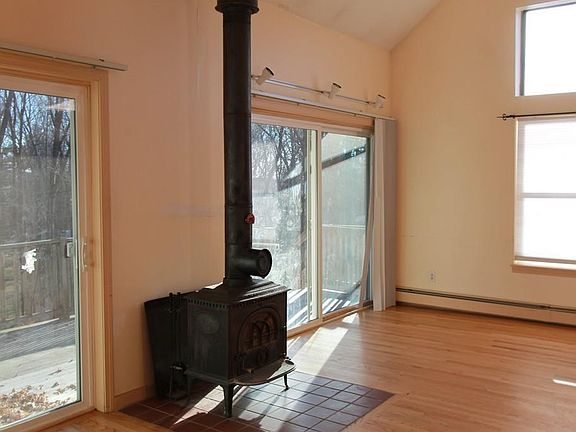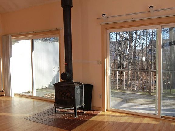 Gorgeous and light filled, cathedral 2 bedroom condex that you must see! If you are looking to invest in yourself and would like to own, this property is a wonderful place and great alternative to a higher priced single family home! Freshly painted, beautiful, and spacious, with lovely yard, private deck, located on a quiet street in Haverhill. Sunny, bright, with cathedral ceilings throughout, beautiful hardwood flooring, wall of sliders to private deck, and wonderful, open concept first floor. Wood burning stove, modern kitchen, large dining room with french doors, finished knotty pine basement with laundry, utility room, large walk in storage closet, and walk out access to back yard. No association fees, just half of the master insurance, saving you more! Come and see all this beautiful condex has to offer you for so much less!