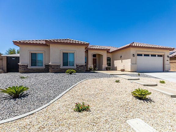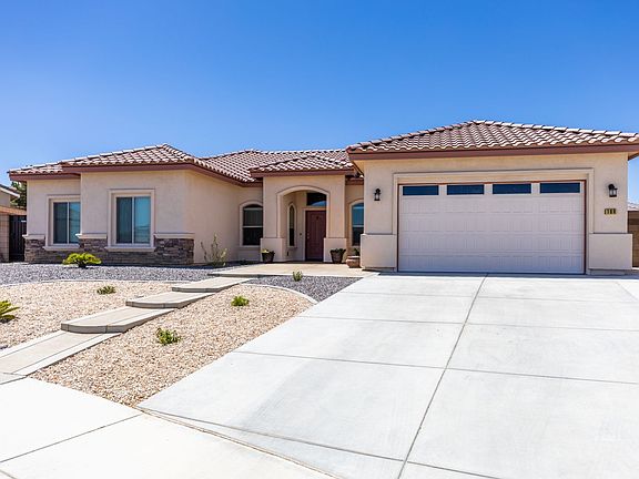 Cul-De-Sac lot! The front yard has been landscaped with rock and drought resistant plants. The home features quartz counter tops in the kitchen and baths. Tile flooring in the entry, great room, kitchen, bathrooms and laundry. Towering 10 ft ceilings throughout the home. Carpet and ceiling fans add comfort to the bedrooms and den. Split floor plan has secluded main suite featuring a full bath with double vanity, 5 ft soaking tub and 5 ft tiled shower with fiberglass pan, walk-in closet and privacy closet. Front den opens to the great room. Indoor laundry set up for both natural gas and electric dryers. Over-sized insulated garage with an insulated roll-up door. R-38 insulation in the attic and R-19 in the walls. Ground mounted AC unit SEER 14. Natural gas tankless water heater. Energy saving windows and LED lighting. Ceiling sprinklers for fire protection. Tile roof provides longevity with a fully trusted covered patio to keep it cool. Large backyard with a concreted side yard! Come take a look!
