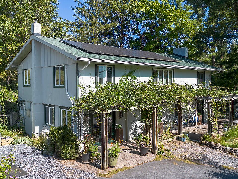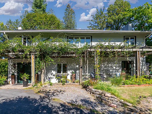 Serenity and sustainability await you in the city limits! Offering quick access to the Woods Creek Trail, Waddell Elem, and historic downtown Lexington, this Carlson Thomas-designed home occupies an elevated site on a quiet cul-de-sac. Relax outdoors on the pergola-shaded front terrace; the sheltered side terrace bounded with lush plantings; and a rear terrace with a dramatic rock outcrop and former water feature. 18 solar panels plus a battery backup ensure reliable, low-cost electricity; efficiency is further enhanced by double-pane casement windows, stucco siding, and 6 recent zoned mini-split heat pumps. A wood stove, fireplace, and gas furnace provide backup heat. With a new roof and water heater in 2024, the home offers 4 BRs, 3 full baths, and over 2700 finished square feet. The first level's open floor plan includes a wide entry hall with a wood stove and rear patio/terrace access; a dining room with built-ins and a custom chandelier; a living room with a wood-burning brick fireplace, access to the front terrace, and a wide opening to the library alcove/den with built-in shelving. Rounding out the first floor are the kitchen (fridge new in 2024), with a gas range and garden views; a full bathroom; laundry room; and storage closets. The home's upper level retains hardwood floors; has 3 bedrooms that share a hall bath; and features a primary suite that includes a sitting room with rear deck/yard access, a bedroom with a spacious closet, and a generous en-suite bathroom.