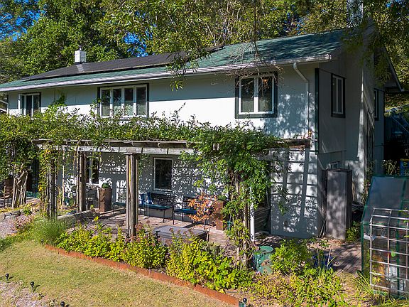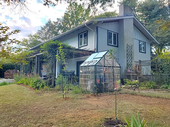 In addition to the paved driveway and the brick paver-surfaced patios, the well-developed landscape incorporates retaining walls, steps between yard levels, and a large and varied collection of native perennials, shrubs, and trees. The uppermost level of the yard provides lawn space and may be accessed from the patios via outdoor steps or from the primary bedroom suite via a spacious deck. A charming greenhouse, a tool shed, and most ornamental garden decor pieces on site are included with the home.