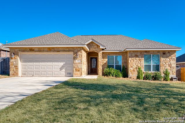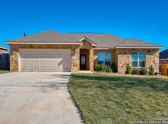 Beautiful, barely lived in 3 bdm/2 bath home on quiiet cul-de-sac. Built 2015- in Northcrest Hills subdvsn w/open concept living, granite in ktchn & baths, custom cabinets, high ceilings, stainless steel appliances, water softener, ceramic tile flring w/crpet, abundant closets, spacious & manicured front & rear yards, covered rear patio, privacy fencing, high speed internet, close to schools, restaurants & shopping. Quality Floresville living at an affordable price! Don't miss out