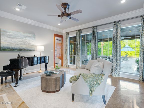 undefined The dining room is large & has a pretty faux finish ceiling. The very much in demand home office features double built in custom cypress desks again with custom cypress cabinets above & below. The huge master suite has a sitting area overlooking the river as well. The master bath features a double vanity, one with a lady's vanity that has a makeup station. There is travertine tile everywhere in the bathroom & dual walk-in closets. There are also 3 other bedrooms & 2 1/2 baths. Now for the best part!! The patio, pool & outdoor kitchen area. This area is amazing. There are so many pluses. A tongue & groove ceiling, slate everywhere, a gunite pool with a waterfall that has just been redone along with the coping as well. The pool has a water control system to control the water levels. The outdoor kitchen has Blaze professional appliances, a built-in power burner, propane grill, separate small burner, refrigerator & sink all beautifully built-in. The backyard is fully landscaped with cypress trees at the water's edge with a bulkhead to protect the land. This is the perfect place to sit & watch the wood ducks fly in & land. Other amenities of the home are a large laundry room with tons of storage, triple crown molding throughout the downstairs, a sprinkler system, slate ridge roof caps, pine floors in the dining room & two downstairs bedrooms, custom plantation shutters & gorgeous draperies throughout. This is one truly impressive home. You don't want to miss this!