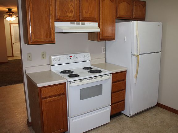 Living room and bedrooms are carpet, Kitchen and dining area are linoleum, both bathrooms are tile.