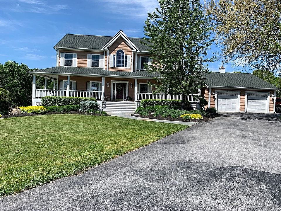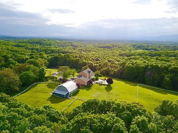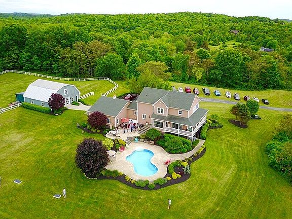 Private, quiet beautifully landscaped three (or four) bedroom, two and a half bath farmhouse with wrap around porch on 22 acres with 4 car attached Heated garage built in 2000. In addition there is a 1,600 sq foot 2 story barn with 10 acres fenced in pasture. You can fit several vehicles in the barn and the 2nd story would make a great home office. This quaint home has an in ground swimming pool surrounded by lovely flowering landscaping and is located in beautiful quiet Milan, NY which is close to the Taconic State Parkway and to Amtrak Train Station Railroad, and minutes away from the center of Rhinebeck village and the center of Red Hook village. This spacious center staircase farmhouse has a wrap around porch perfect for relaxing and enjoying the views of this picturesque property! The foyer with marble floor and cathedral ceiling allows light to shine through into the main entrance. A large living room with a beautiful view of the property. A gorgeous stone gas fireplace is the centerpiece of the room with a glass atrium door giving you access to the wrap around porch. The kitchen nook overlooking the pool provides magnificent views of the property. The kitchen has white cabinetry with gorgeous blue corian counter tops giving this kitchen a country farmhouse feel. The dining room is right off the kitchen to host many family and friend gatherings. Off the kitchen is a half bath and a laundry room that brings you out to the heated 1,120 sq ft 4 car garage. The beautiful hardwood finished staircase takes you up to the top floor where master bedroom has a view looking at the catskill mountains; with a large walkin shower and walkin closet. The other 2 bedrooms each have both walkin closets with a Jack and Jill bathroom. The bottom floor is finished with a family room and off of that can be used as a bedroom or home office. This has it's own entrance. It is bright and cheery as you walk out the sliding glass door to a walkway to the pool. The barn with its white fenced in pasture sets this beautiful home off giving it that quiet, country setting. THIS IS A MUST SEE to appreciate the spectacular beauty of this home and property. This is a one owner home. To schedule an appointment to see this home please call (845-234-6184).